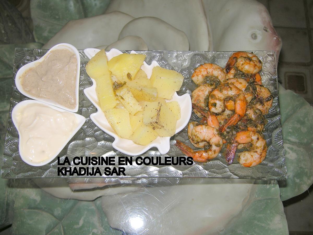 Servir les crevettes accompagnées de pommes de terre cuites à la vapeur, de sauce mayonnaise et de sauce poivre.