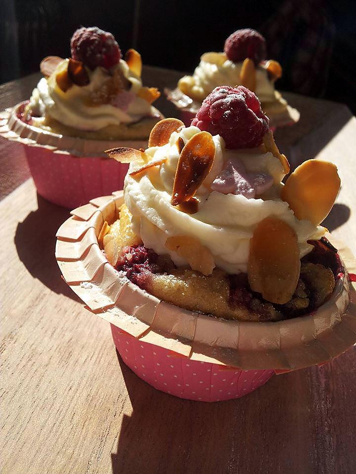 Étape 4Maman nappe chaque cupcake refroidi de chantilly et les parsème d'amandes effilées et d'une framboise.