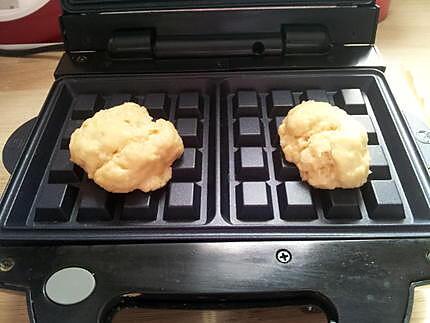 Étape 4Maman fait chauffer le gaufrier puis dépose une bonne cuillère à soupe de pâte au centre des plaques, referme et laisse cuire.