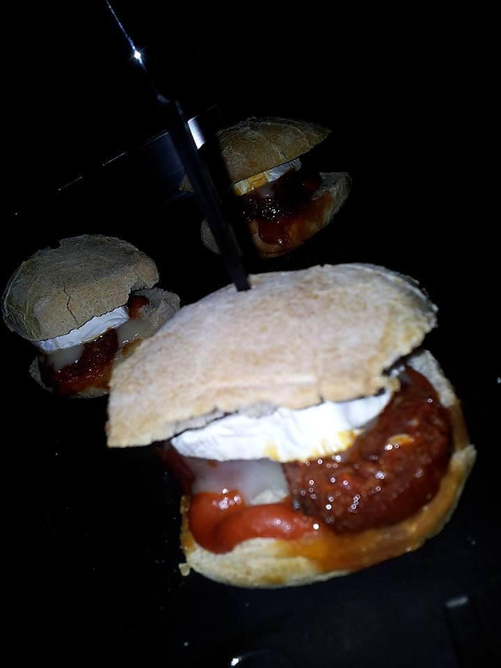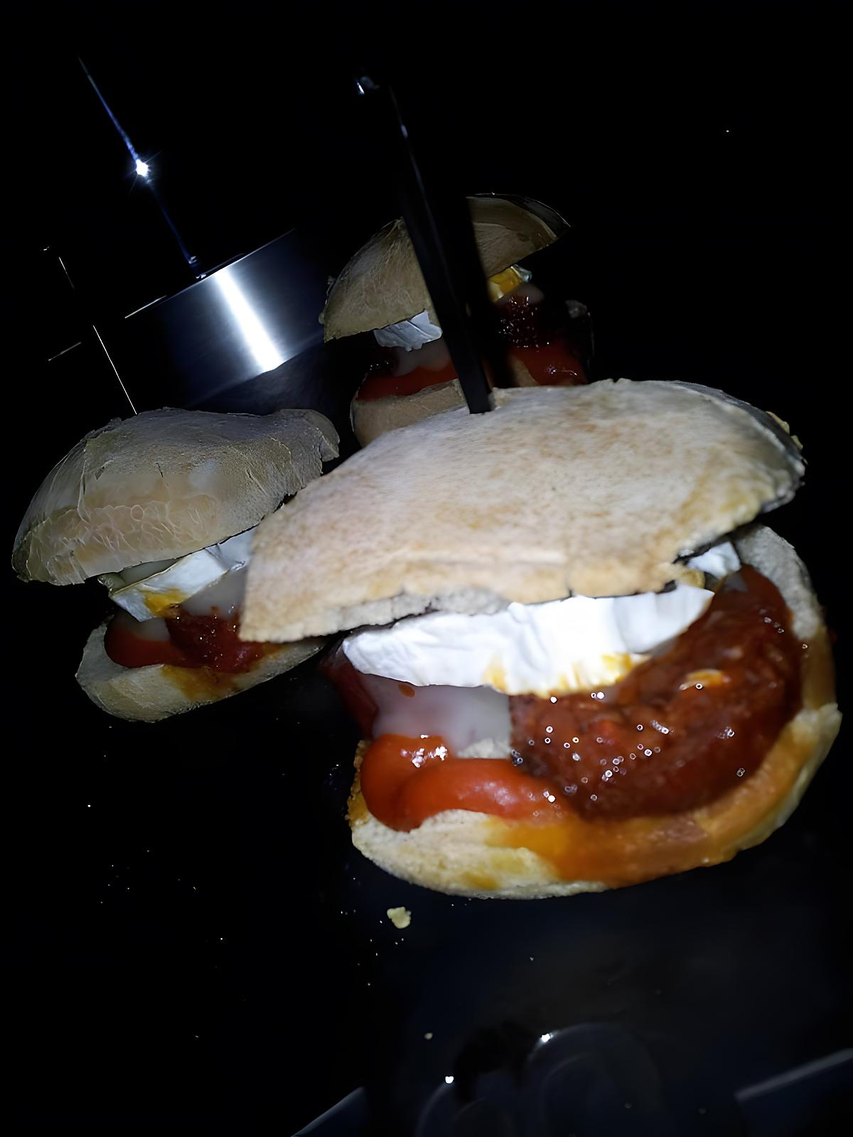 Maman met le coulis de tomate sur le pain à burger du bas puis elle met 2 rondelles de chorizo et une de fromage de chévre referme avec le pain du haut et enfourne quelques minutes à peine dans le four et sert aussitot dés la sortie du four.