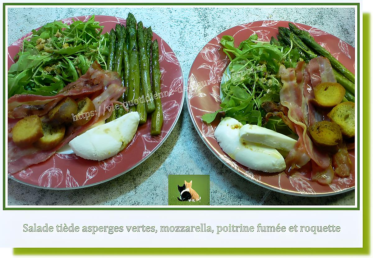 Mes conseils et impressions : https://vie-quotidienne-de-flaure.blogspot.fr/2016/09/salade-tiede-asperges-vertes-mozzarella-poitrine-fumee-roquette.html