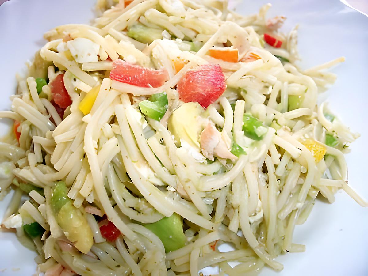 75G de spaghetti, Sel, 1,5 Cuillerées à soupe de beurre liquide, 1/2 Portion de salade de blé, 1/2 Citron, 1 Poivron rouge125G de tomates cerises 1/2 Gousse d'ail,1/2 Poivron jaune