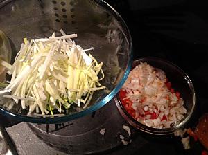 - Les poireaux en fines lamelles, les poivrons (pelés) et les oignons en petits dés, quand aux fèves, les cuires quelques min à l'eau