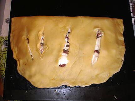 Étape 3Préchauffer le four à 180°C. Étaler la pâte en forme de rectangle et laisser monter pendant 30 minutes. Sur la moitié de la pâte, faire 3 grands trous avec l'aide d'un couteau. Sur l'autre moitié, mettre le gruyère et le jambon, puis ajouter les herbes de Provence et la crème. Refermer la pâte en badigeonnant d'eau les bords pour souder. Enfourner pendant 20 à 25 minutes à 180°C. Déguster avec une salade.