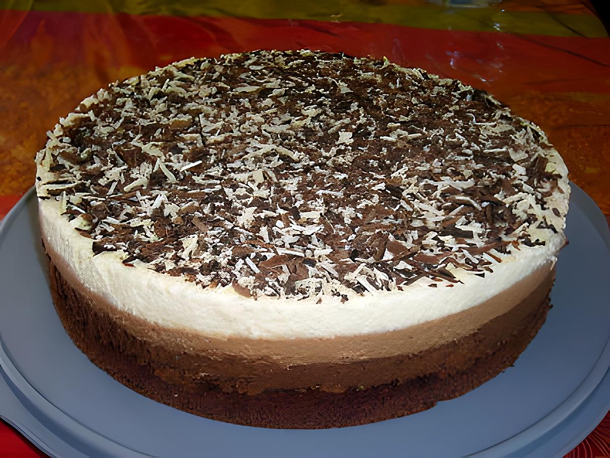Mots-clés: 3 chocolats, bavarois, chocolat blanc, chocolat lait, chocolat noir, croquant de praliné, gavottes, mousse, pralin, praliné
