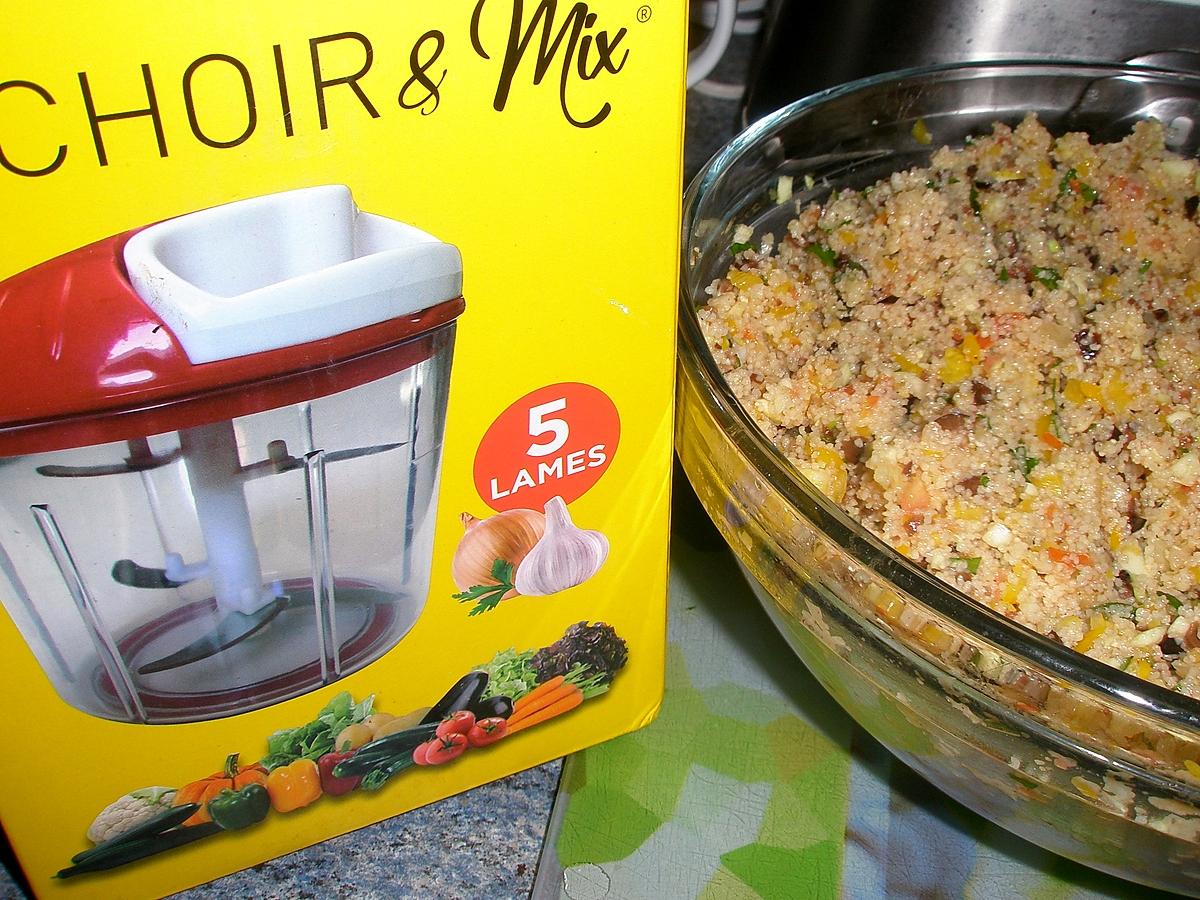 Terminer en mettant dans le bol du hachoir la semoule et le même volume d’eau et « hacher » (sinon mettre l’eau et la semoule avec les légumes hachés et mélanger bien).