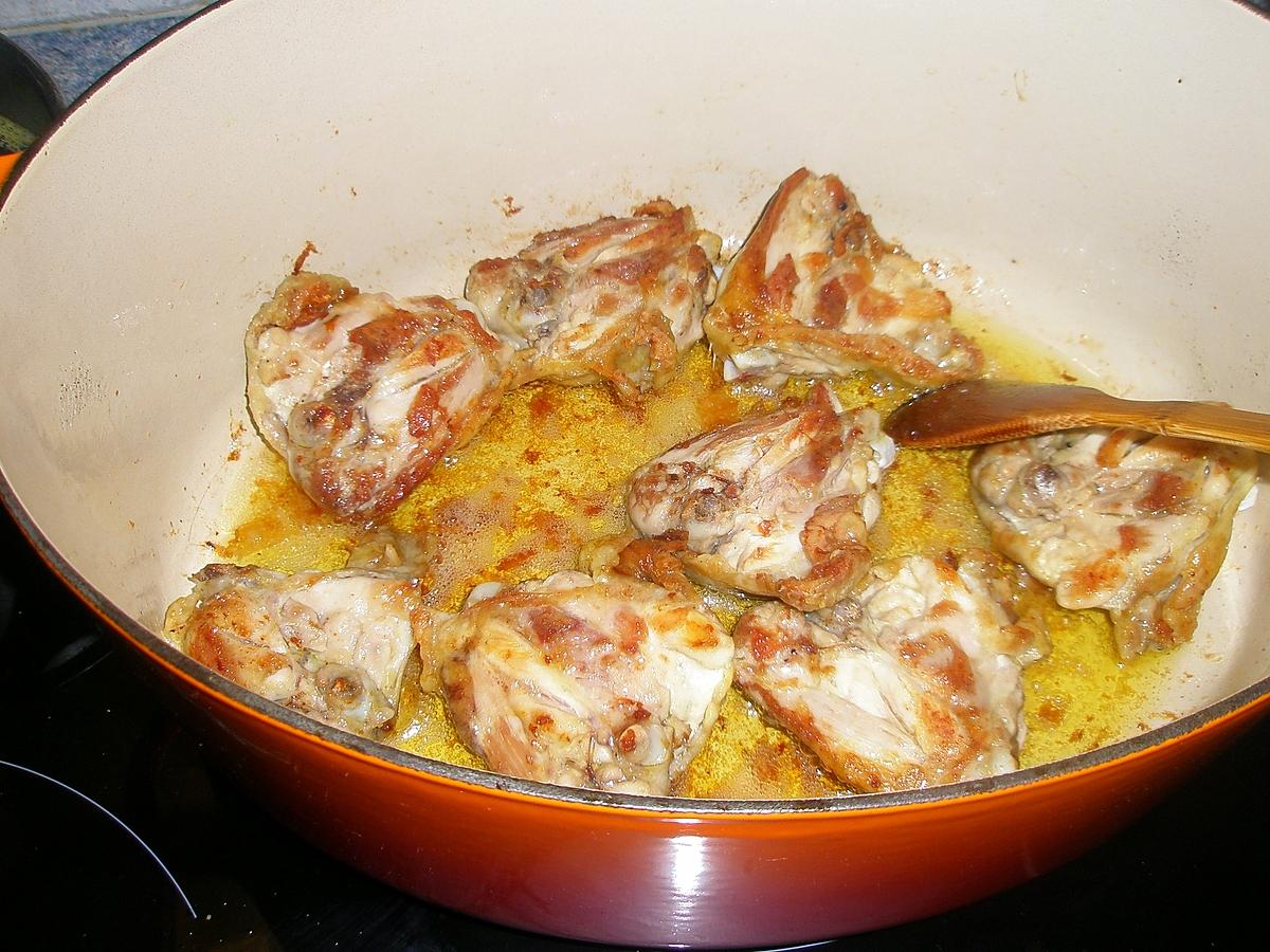 Dans une cocotte en fonte faire revenir le poulet dans un peu d’huile d’olive et beurre.