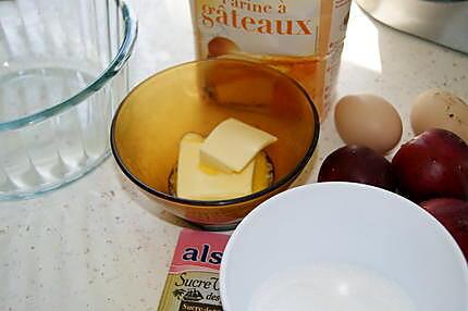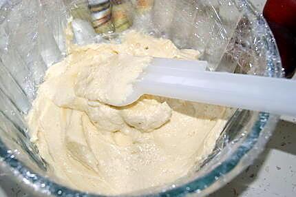 Ajouter le sucre en continuant de battre, puis la farine, puis le beurre fondu.