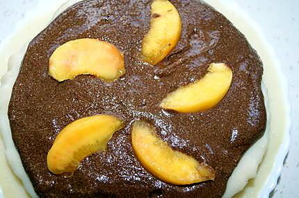 Gâteau aux brugnons à la crème et à la mousse au chocolat au micro-ondes.