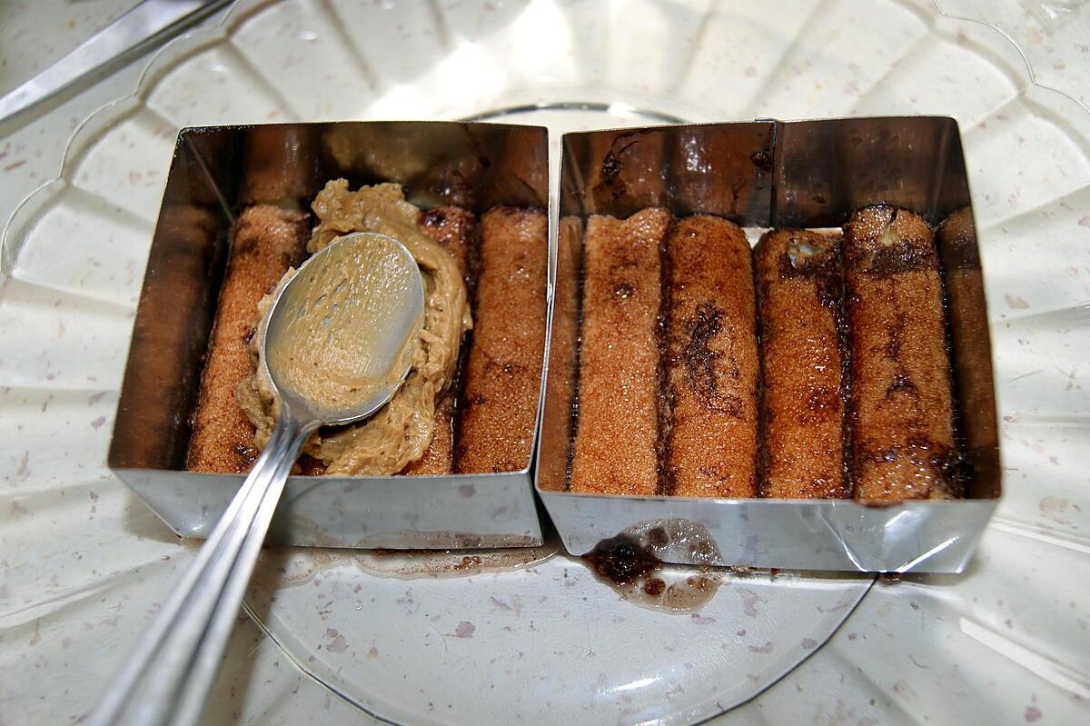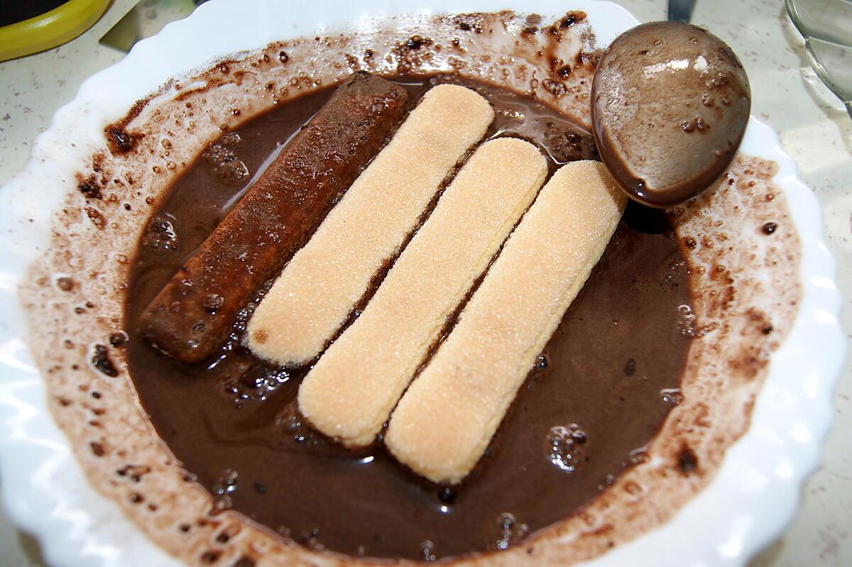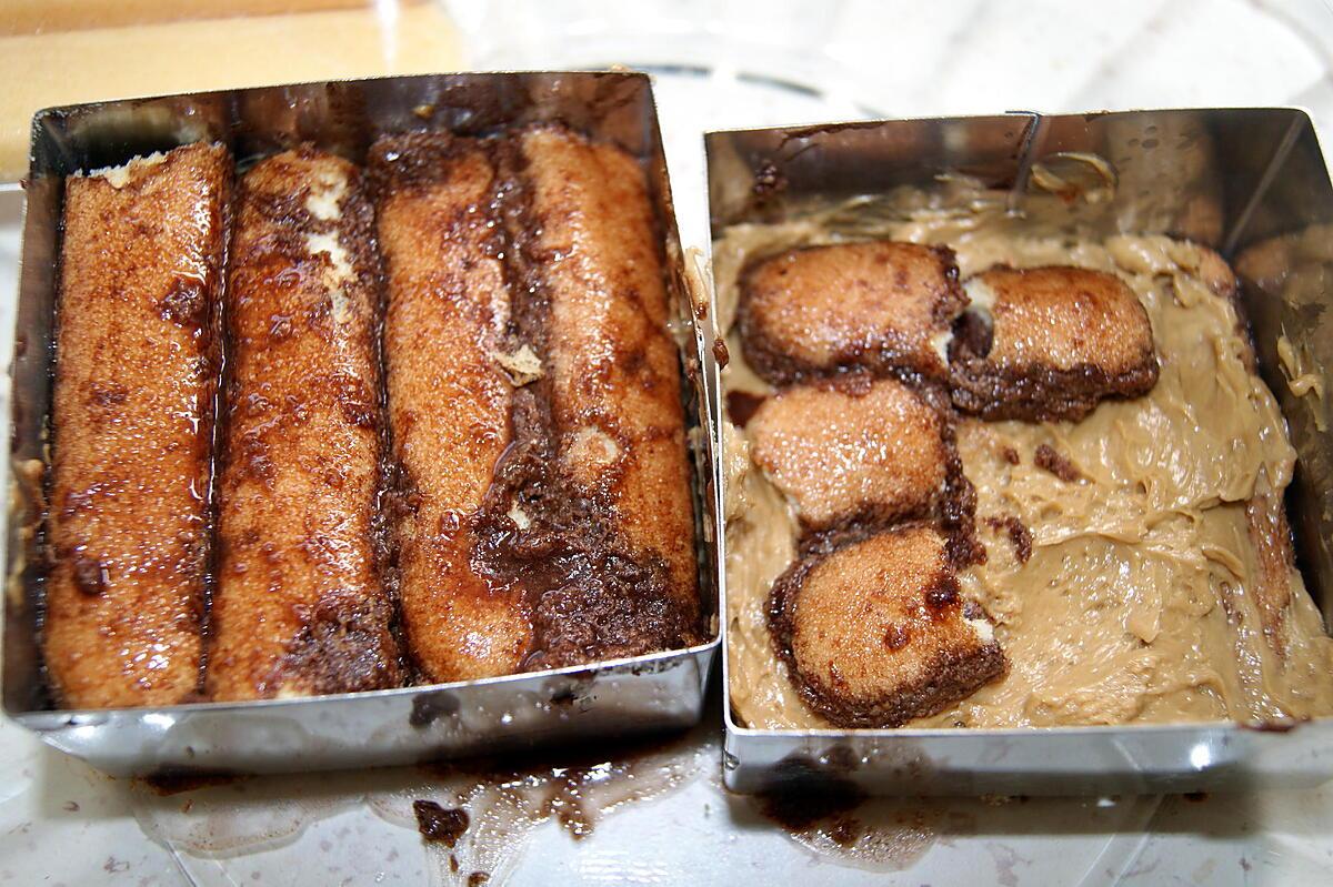 Poser pas trop longtemps 4 boudoirs dans l'assiette de chocolat et les placer dans les moules (en coupent le gâteau à la longueur du moule).
