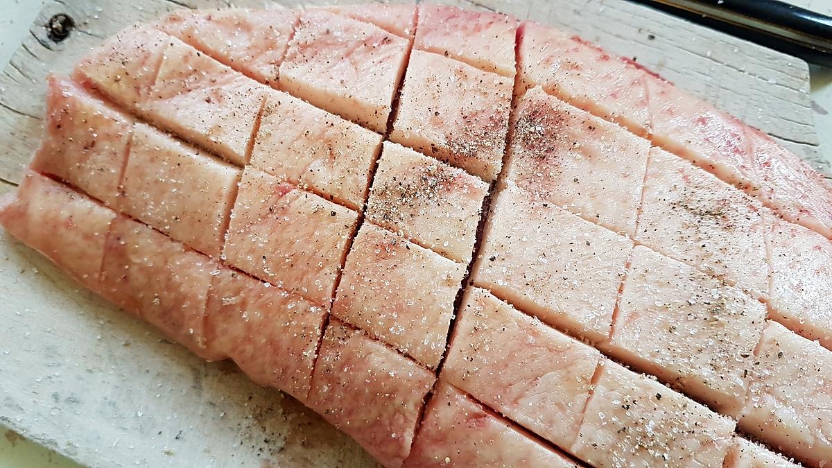 Quadriller la peau du magret avec un couteau.