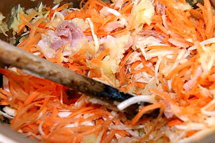 Mélanger le tout et mouiller avec le bouillon chaud.