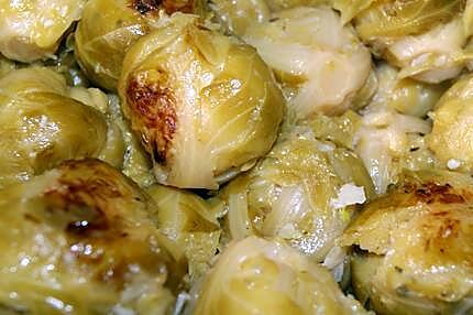 Nettoyer, laver au vinaigre, fendre les choux de bruxelles. Mettre dans un récipent avec du bouillons de cuisson ci dessus et cuire environ 15 minutes, puis les égoutter. Rajouter un peu d'eau si nécessaire à la viande.