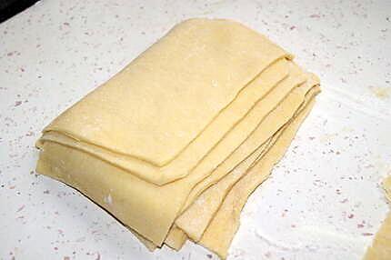 Puis l'étaller de manière à pouvoir faire 8 petits pains ou (8 croissants) dans chaque paquet de pâte (environ 60 cm sur 30). Attention vous n'êtes pas obligé de faire les deux (elle se garde parfaitement trois jours au réfrigérateur) ou au congélateur.