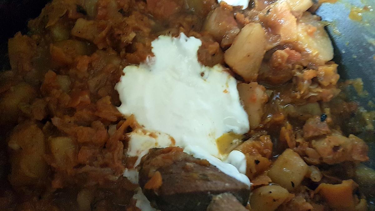 Faites le revenir dans la cocotte minute ou dans un wok (avec de l'huile d'olive ou autre selon goût), ajoutez les pommes de terre, les carottes, l'ail, clou de girofle, le sel et le poivre.