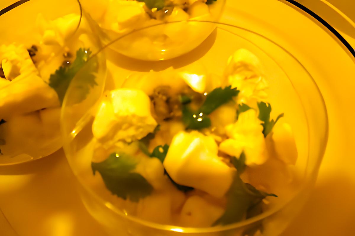 Ajoutez les dés d'ananas, et versez par dessus le mélange fruits de la passion/coriandre.