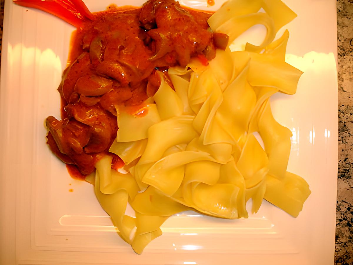 1 Filet mignon de porc (environ 600 g)1 Oignon1 Gousse d'ail pressé1 Poivron rouge200 G de champignons de paris boite ( ou frais)30 G de beurre1 Cube et demi bouillon de volaille émiettée2 C. À soupe d'huile 1 C. À soupe de paprika1 C. À soupe de farine5 Cl de madère15 Cl de crème fraîche30 Cl d'eau chaude1 C. À soupe de concentré de tomatesSel, Poivre