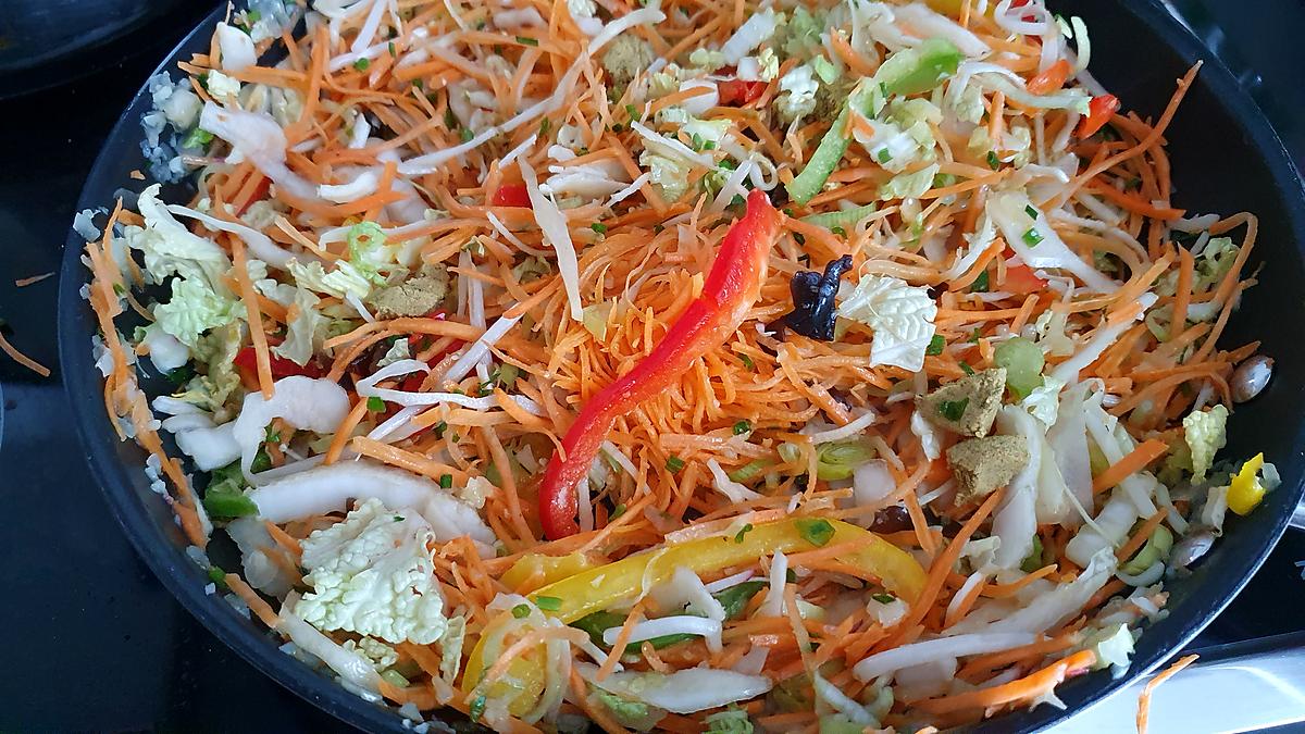 Faites chauffer trois cuillères à soupe d'huile dans une poêle ou wok, ajouter l'oignons et l'ail laisser revenir 2 mn puis ajouter les légumes env. 5-8 min faire revenir en remuant, retire du feu réserve.