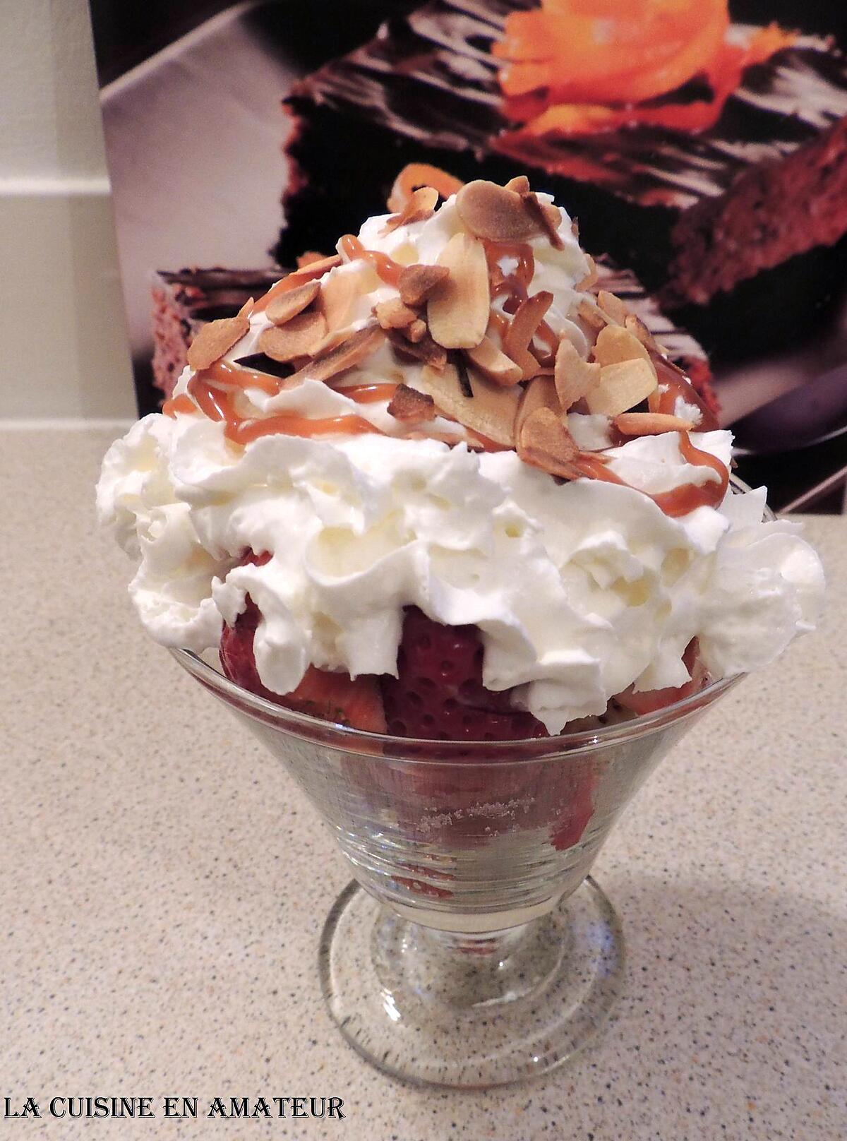 FraisesCoulis de chocolat ou caramel beurre salé de RégilaitGlace vanille Bombe de chantillySucreAmandes effilées