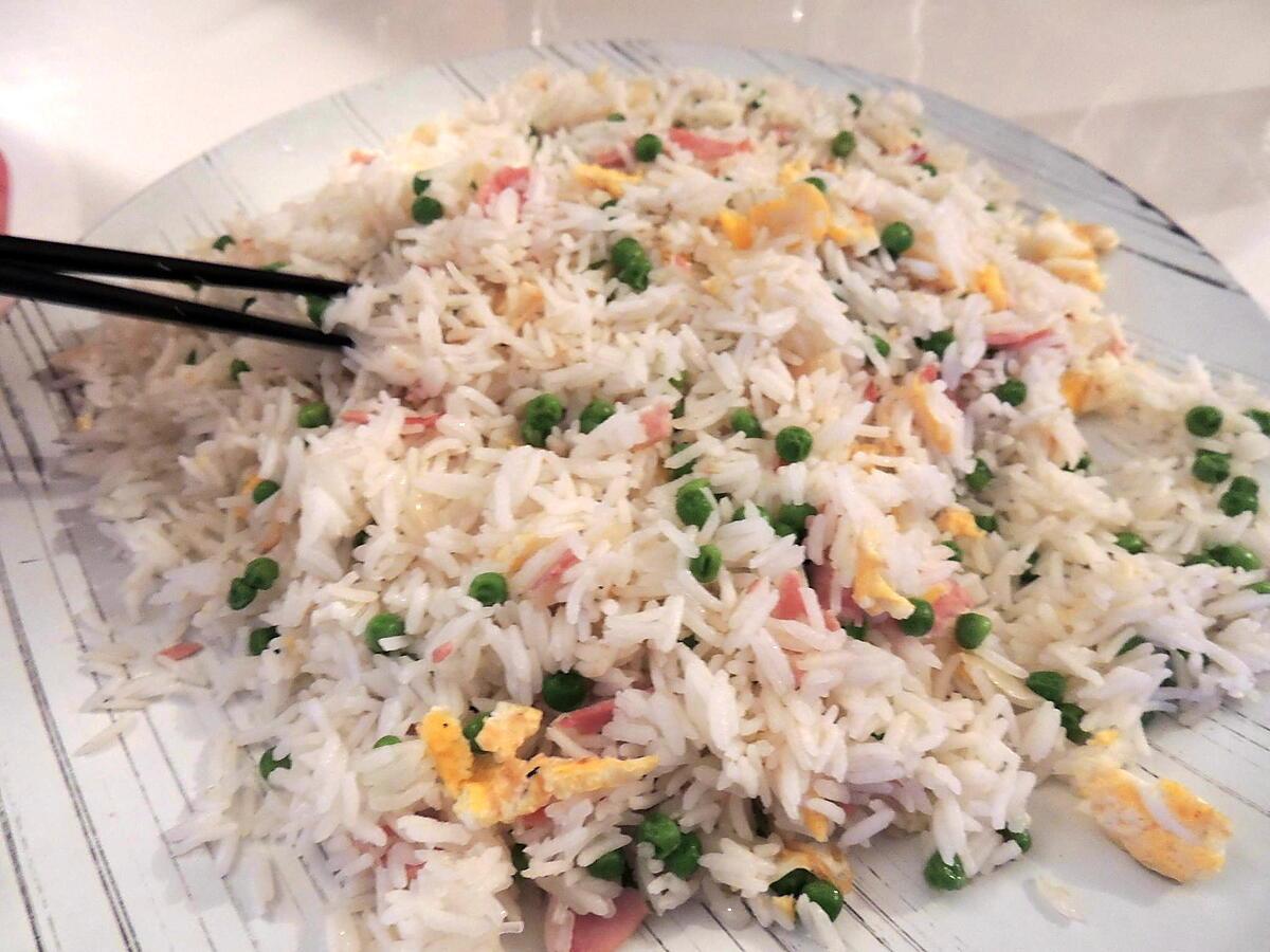 200 gr de riz2 oignons2 oeufs2 tranches de jambon blanc1 petite boîte de petits pois1 oignon3 cs d'huile de tournesol ou de Sésame3 cs de sauce de sojaSelPoivre