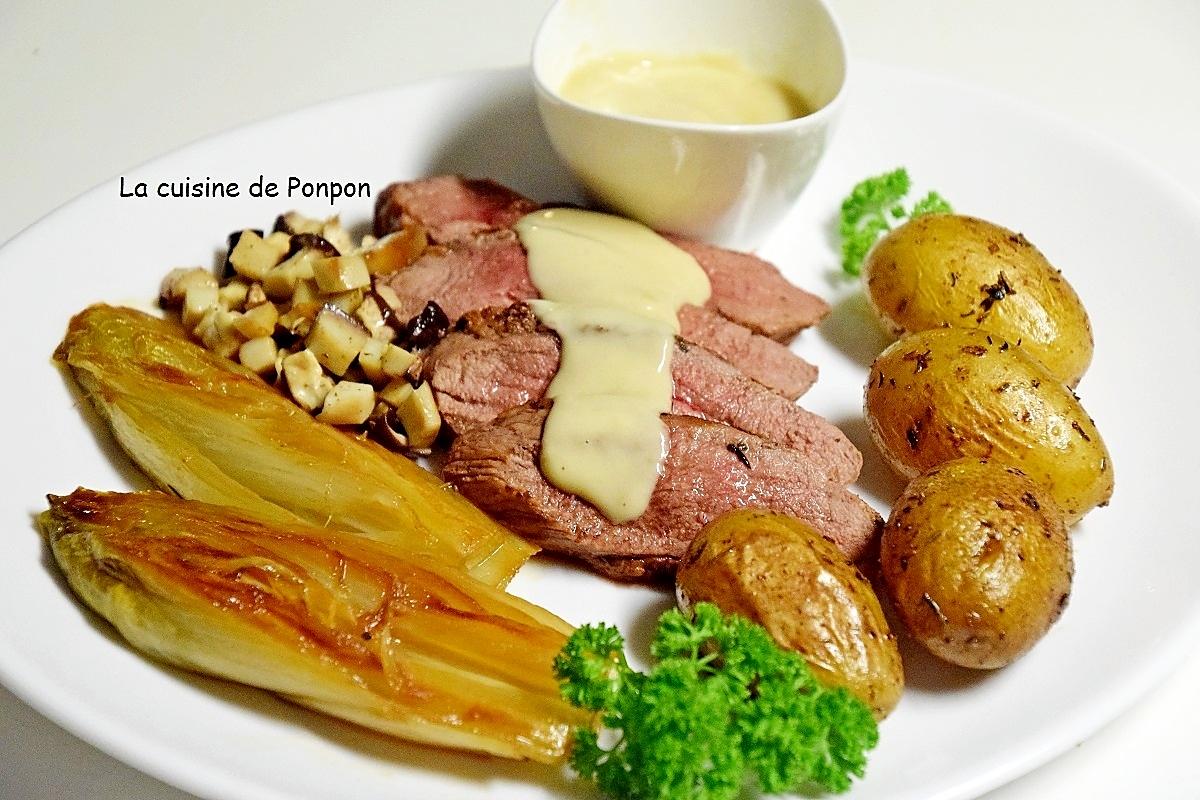 Magret de canard garni de sauce au foie gras, pommes de terre, chicons et champignons