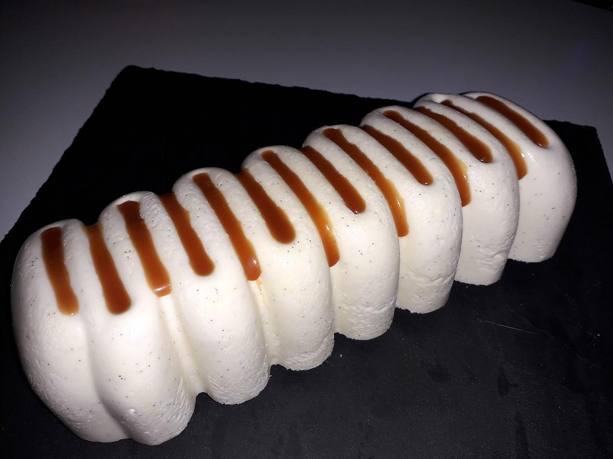Dans un moule a bûche verser la bavaroise jusqu'à moitié puis placer l'insert congelé au centre en appuyant légèrement afin de faire remonter la bavaroise sur les côtés. Verser le restant de bavaroise puis disposer le biscuit.