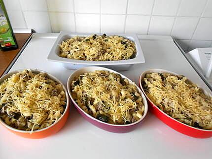 Gratin de coquilletts et cougettes au boeuf moutardé.