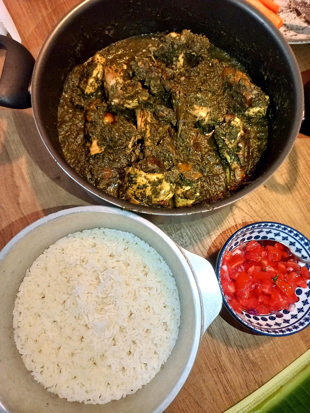 1 Poulet fumé 500G de feuilles de manioc 1 Gros oignon 5-6 Gousses d'ail 3Cm de gingembre 1 Tomate Sel Huile 1 Boite de lait de coco