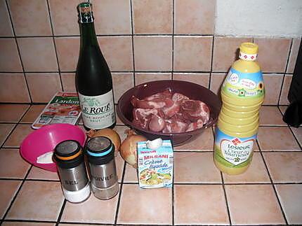 Environ 600 g d'échine de porc 2 Oignons 1 Bouteille de cidre brut 2 Cuillères à soupe de farine 200 G de lardons fumés 20 Cl de crème liquide Sel Poivre