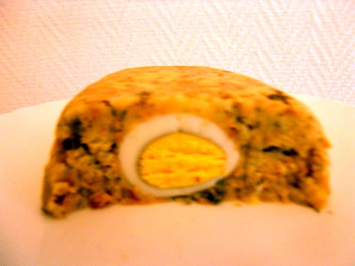 Étape 6Filmez une terrine, versez dans le fond une couche de purée, alignez les œufs durs dessus au milieu et recouvrez avec le reste de purée.
