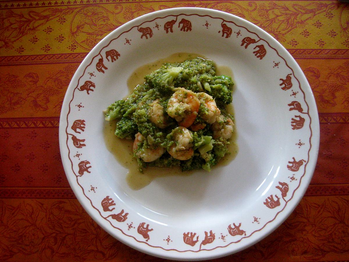 500 Gr de scampis moyens,300 Gr de brocolis surgelés ou frais1 Dl de bouillon de poule0,5 Dl de vin blanc2 C à s de sauce soya salée3 C à s d'huile d'arachide3 Éclats d'ail2 Cm de gingembreCiboulette fraîcheJus de citronSel et poivreLiant instantané pour sauce