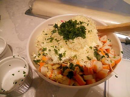 Bans un grand saladier melanger vos oeufs brouillé avec le surimi, fromage frais, fromage rapé, persil sel et poivre, bien melanger tous les ingredients.