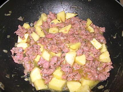 Faire revenir les échalotes et l'ail émincés dans de l'huile d'olive pendant 2 minutes. Ajouter la chair à saucisses ou la farce de veau qui est moins grasse, et laisser cuire en mélangeant pendant quelques minutes, la viande ne doit pas être complètement cuite. Eteindre le feu, égoutter et ajouter la pomme épluchée et coupée en dés, l'oeuf battu, le sel et le poivre.