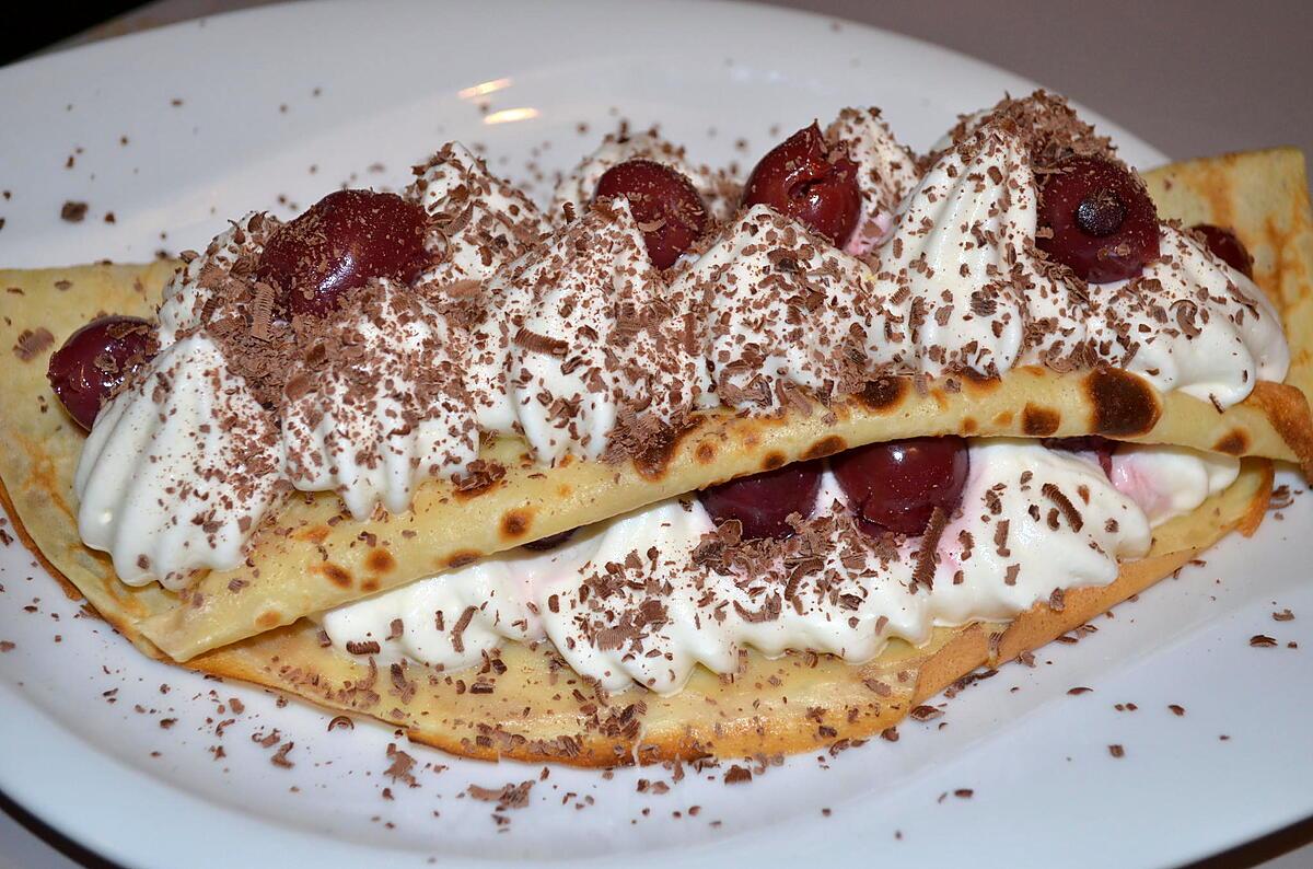 • Replier la crèpe en 2, déposer à nouveau des rosaces de chantilly, puis des cerises, et enfin saupoudrer des copeaux de chocolat.