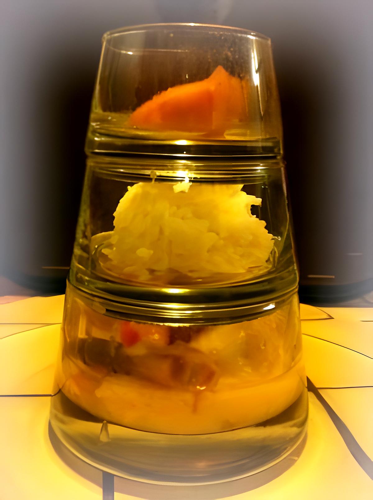 Étape 11Pour la présentation, nous avons mis la blanquette de poisson dans la verrine du bas, le riz au milieu et une tranche de saumon dans la verrine du haut.