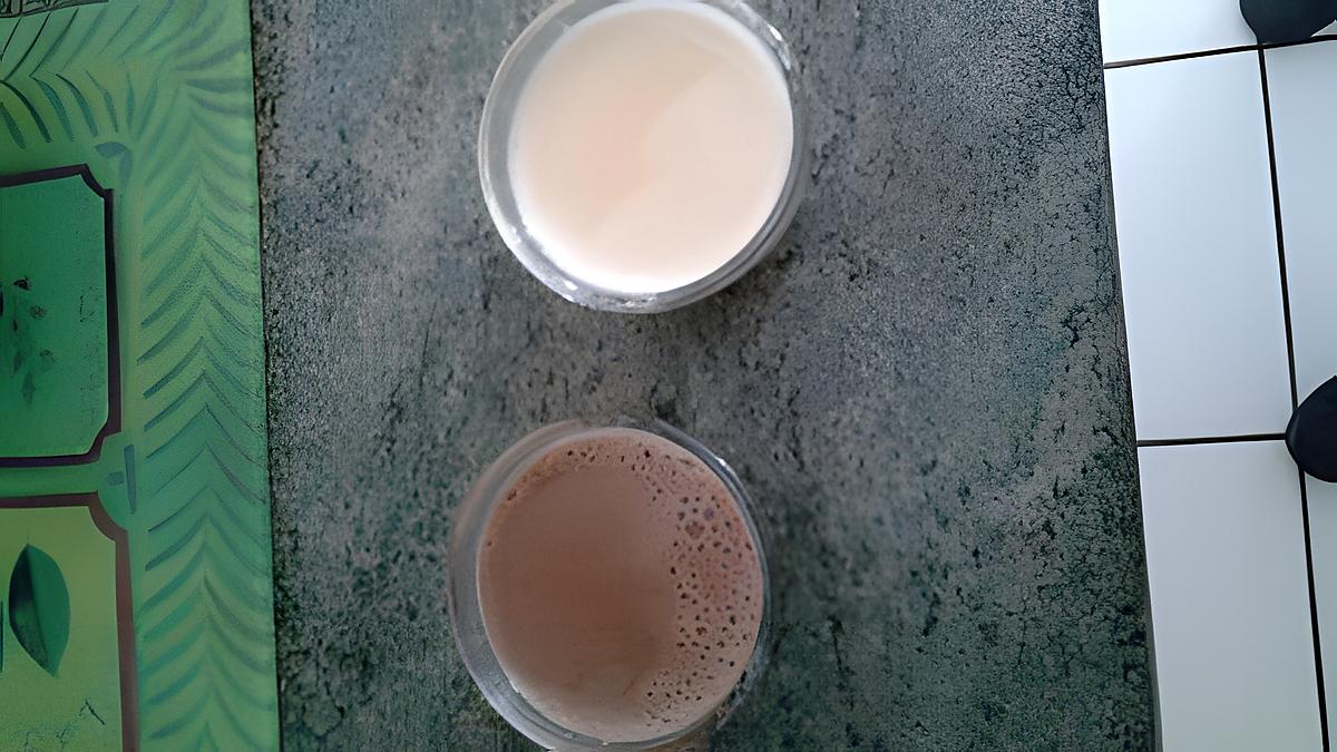 50Cl de lait 1/2 écrémé 2G d'agar-agar 1Cc d'édulcorant liquide ou 1cs de sucre 1Cc de vanille liquide 1Cc de chocolat