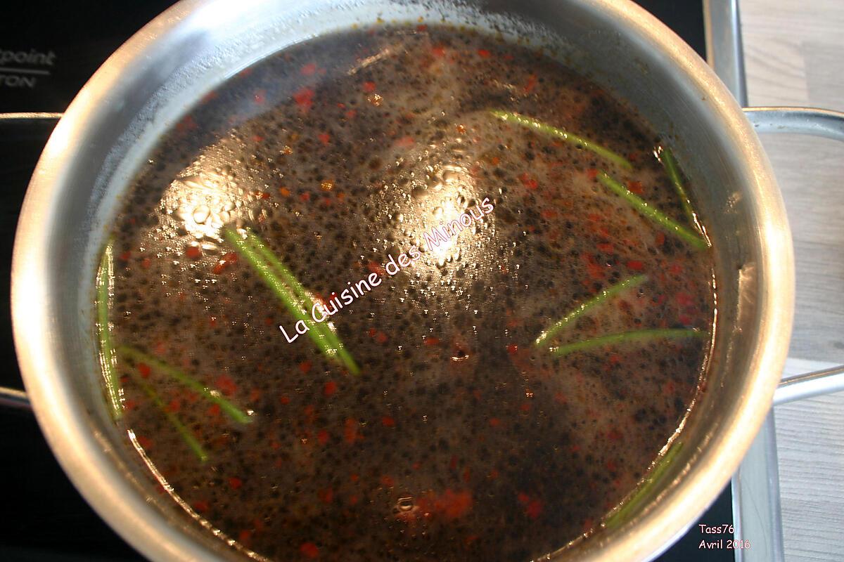Verser le bouillon de bœuf dans une casserole, ajouter les racines et tiges de coriandre et la poudre de 5 parfums.