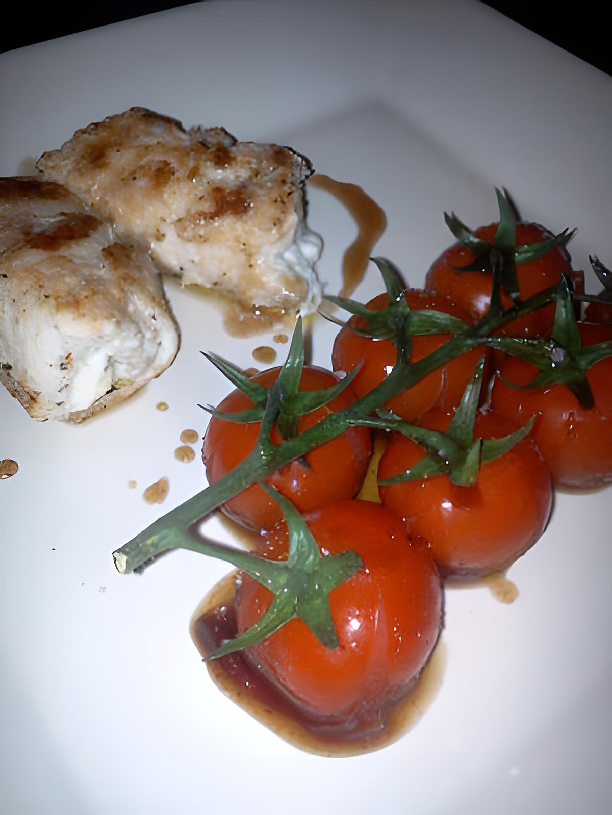 Pendant ce temps, confire les tomates. Dans une casserole, verser le miel, les épices et le vinaigre balsamique. Laisser chauffer quelques secondes et ajouter les tomates, laisser caraméliser 5 min à feu doux, eteigner le feu et couvrer.