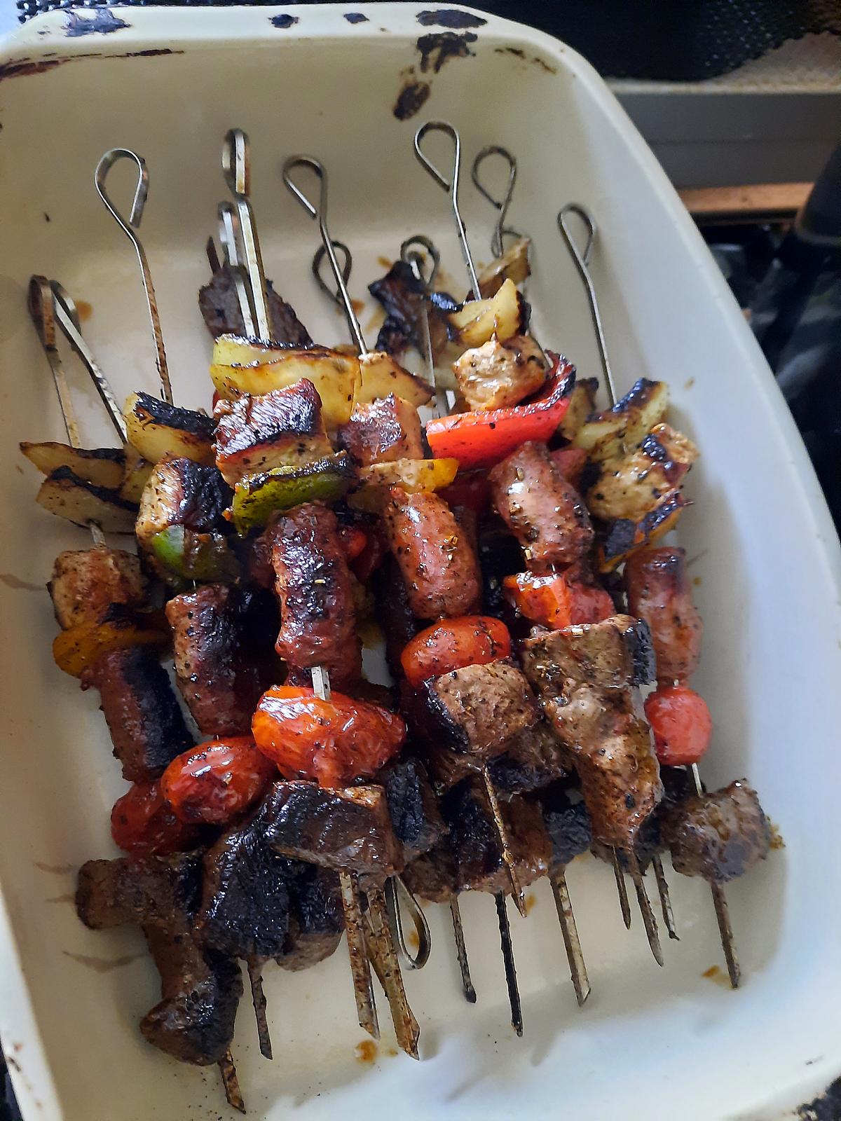 Enfiler sur les pics à brochettes, faire cuire au barbecue avec sel, poivre et herbes de Provence.