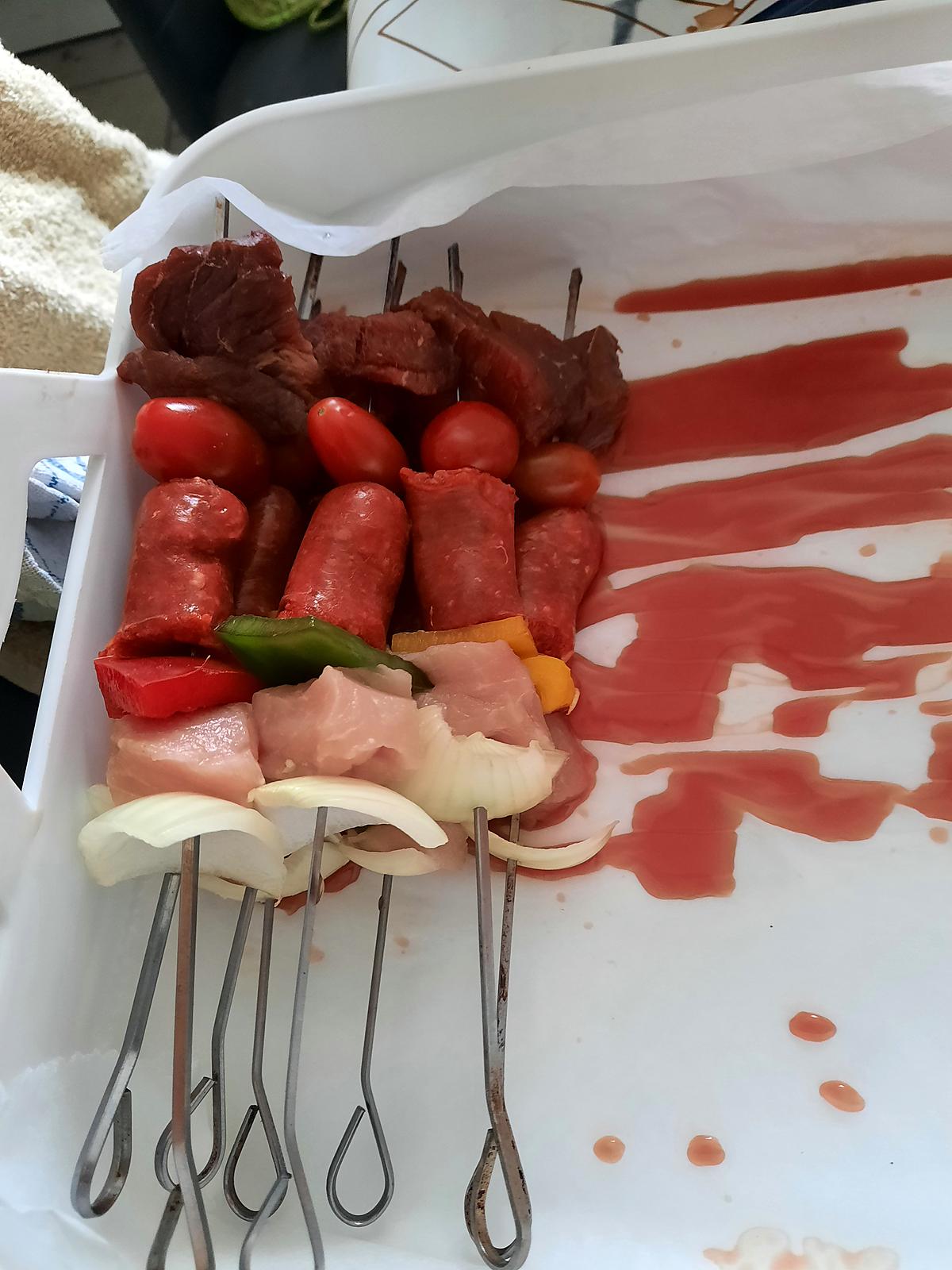 pour une cinquantaine de brochettes viandes, légumes: 1kg500 de bœuf, 1kg500 de porc, 12 merguez, oignons, tomates cerises, poivrons., Sel, Poivre, Herbes de Provence