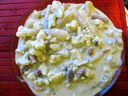 Couper le poulet en cube (si poulet choisi). Dans une poele légerement huilée faire cuire la viande (poulet ou lardons). Ajouter alors la sauce précedemment préparé, le chou fleur égoutté, les salsifis, le sel le poivre, le paprika et l'ail, remuer et laisser mijoter a feu doux 3 a 4 mns.. Ajouter 1 figue coupé en morceau.