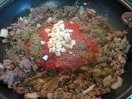 Étape 8Ajouter ensuite la sauce tomate et l'ail, puis les herbes de Provence, le sel et le poivre, et cuire pendant 15 minutes en mélangeant.