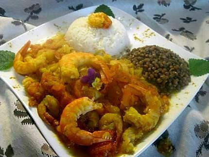 Étape 6Le cari aux crevettes est prêt, servez vos assiettes et accompagnez de riz et lentilles.