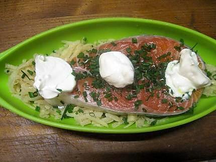 Papillotes de saumon, pommes de terre, crème et ciboulette au micro-ondes.