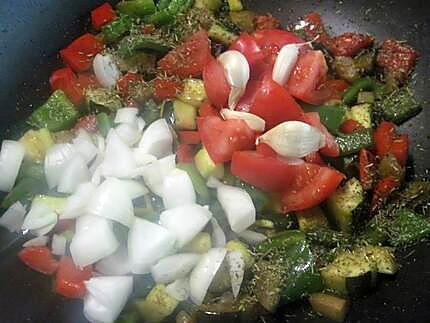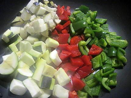 Étape 9Dans une poêle haute, mettre de l'huile d'olive, les cubes de poivrons, de courgette et d'aubergine, puis mélanger.